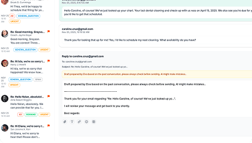 Elva's reads and replies to patient emails 24/7 in any language. Connected to your PMS, it gives accurate, personalized answers instantly.