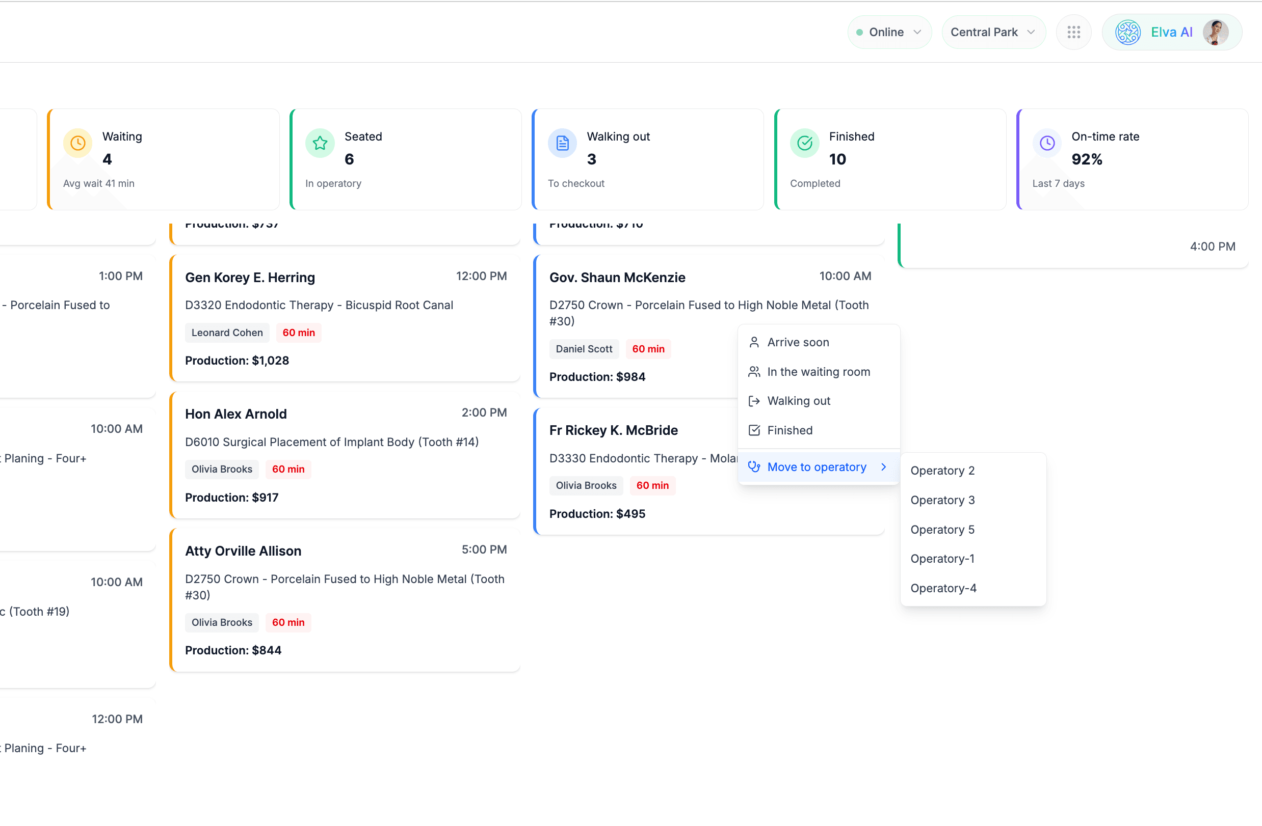 A 20-minute wait ruins the patient experience. Elva tracks "Time in Status" for every patient. If a room sits empty too long or a patient has been waiting over 15 minutes, the card turns red to alert you. This visual feedback loop lets you spot traffic jams instantly, like a hygienist running behind or a front desk backup, so you can jump in, reallocate resources, and get the flow moving again before patients get frustrated.