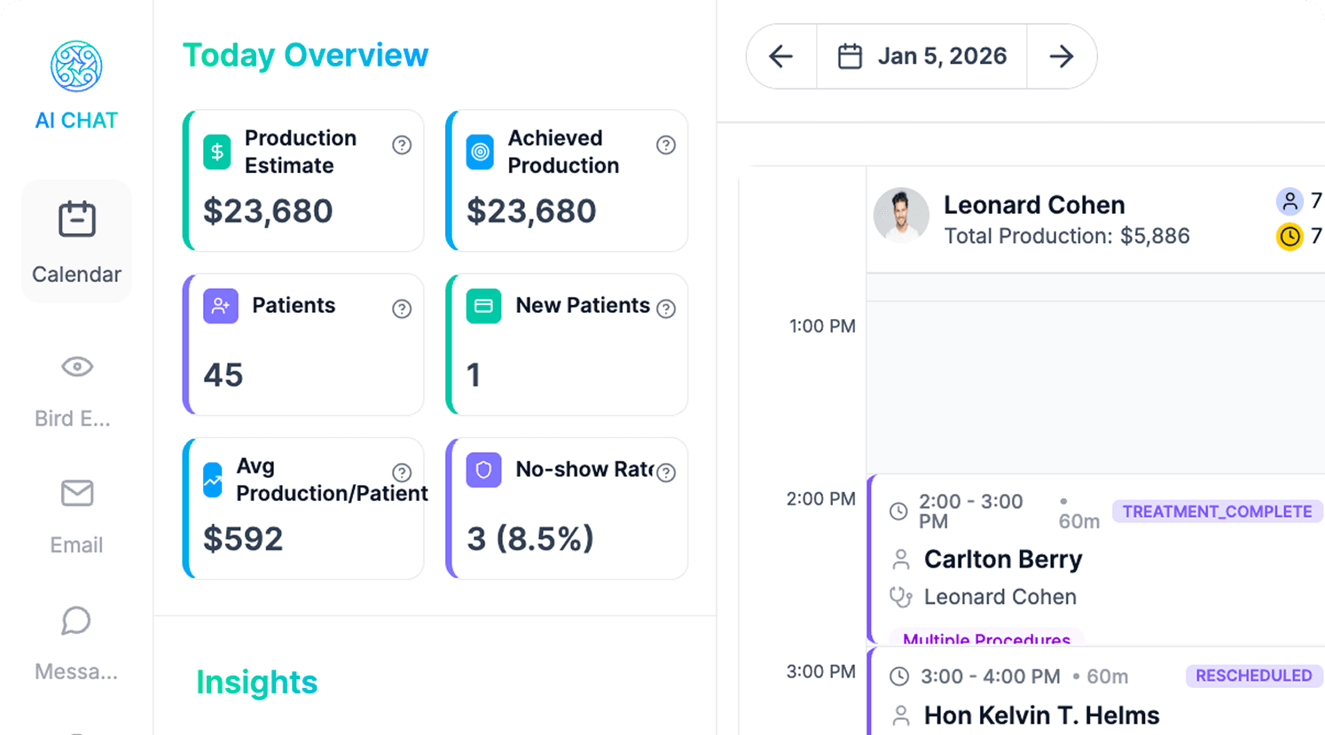 Stop running your day from a static calendar. Elva's Bird Eye View is a live, real-time dashboard that tracks every patient's journey, from "Arrive Soon" to "Finished." See your wait times, manage patient flow, and get a 30,000-foot view of your entire operation, all on one screen.