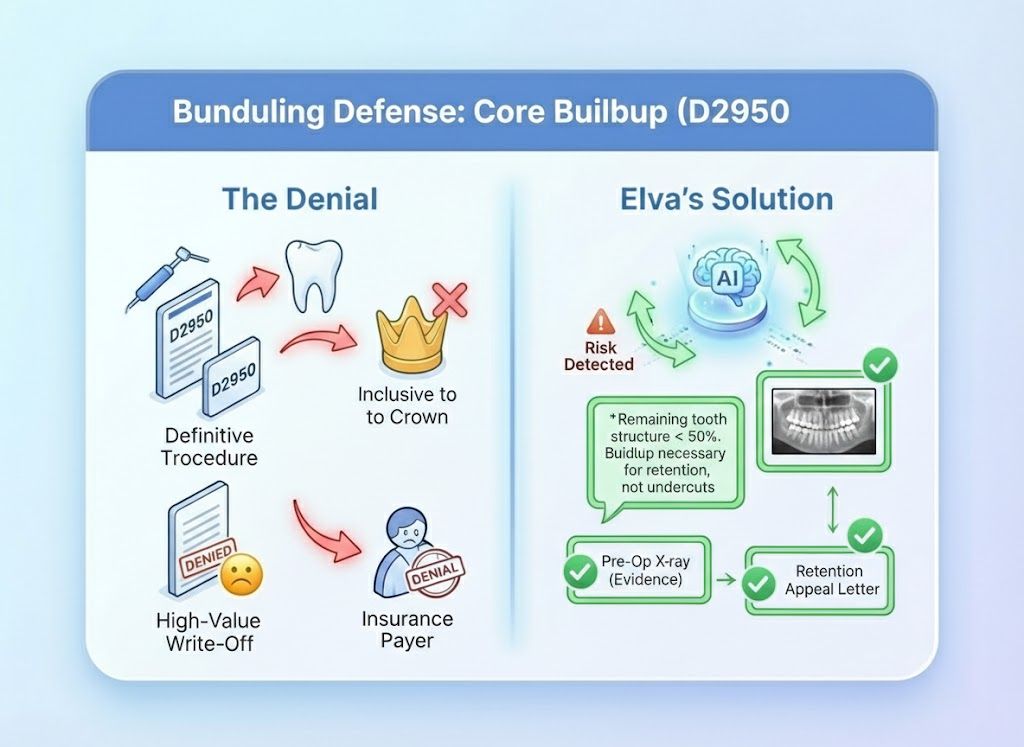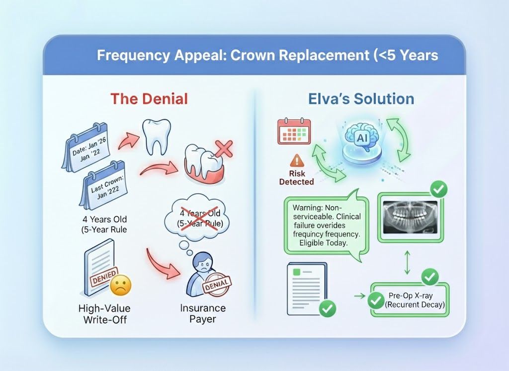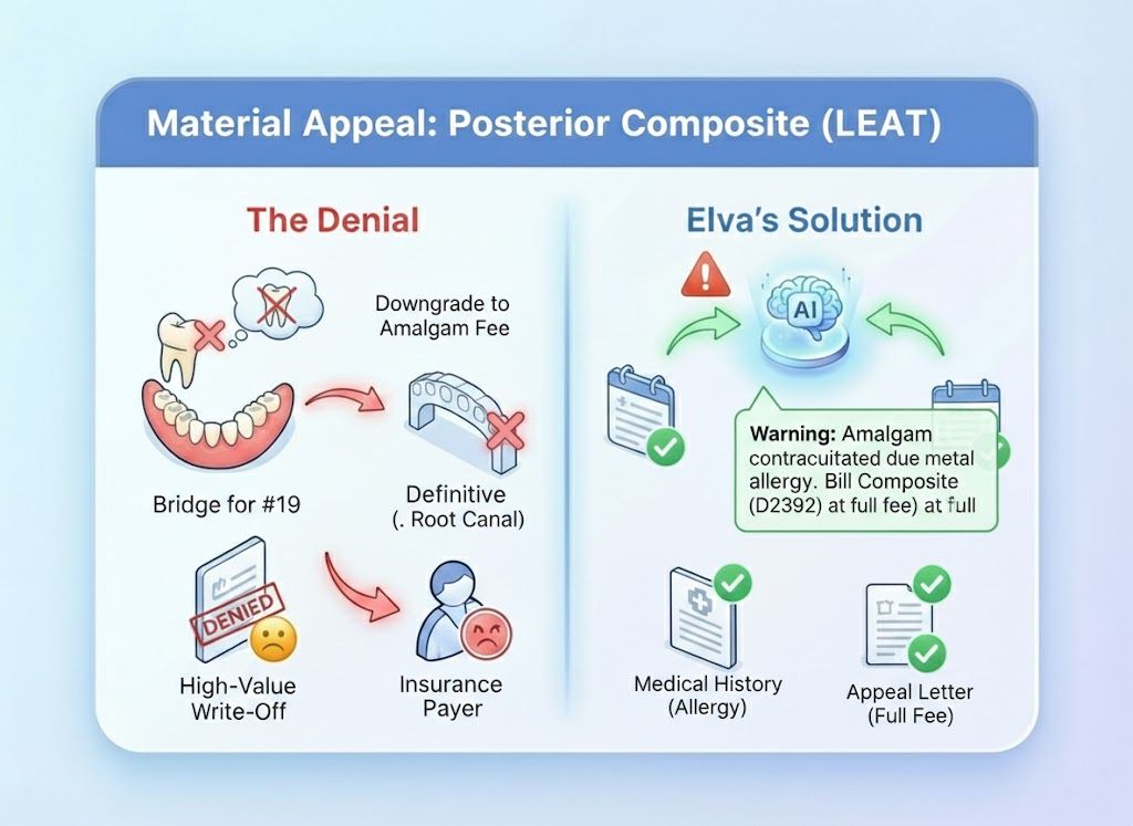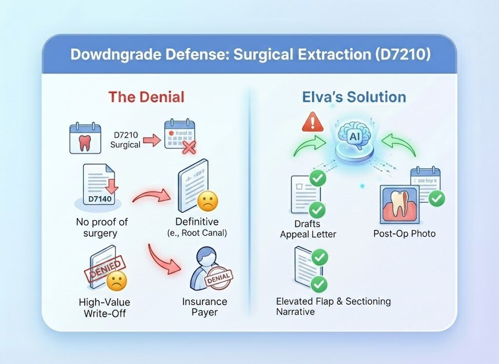 The Old Way (Spreadsheet Purgatory): You get a stack of EOBs. You highlight the denials, put them in a folder, and plan to "get to them Friday." Friday never comes. You eventually write off thousands of dollars because you didn't have time to find the X-rays and write the letters. The Elva Way (Instant Rebuttal): Elva sees the denial the moment the ERA lands. It pulls the X-ray, highlights the pathology, drafts the appeal letter, and puts it in your "Ready to Send" queue. You recover revenue while you sleep.