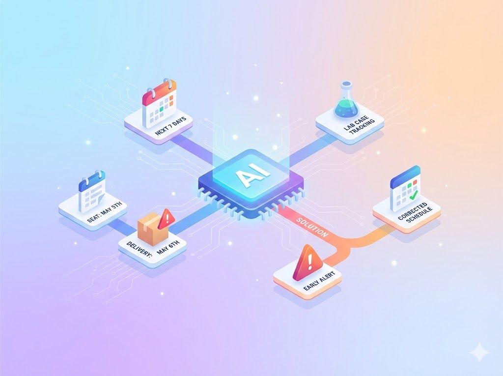 Scans for operational failures before they happen, such as missing lab cases for upcoming crown seats.